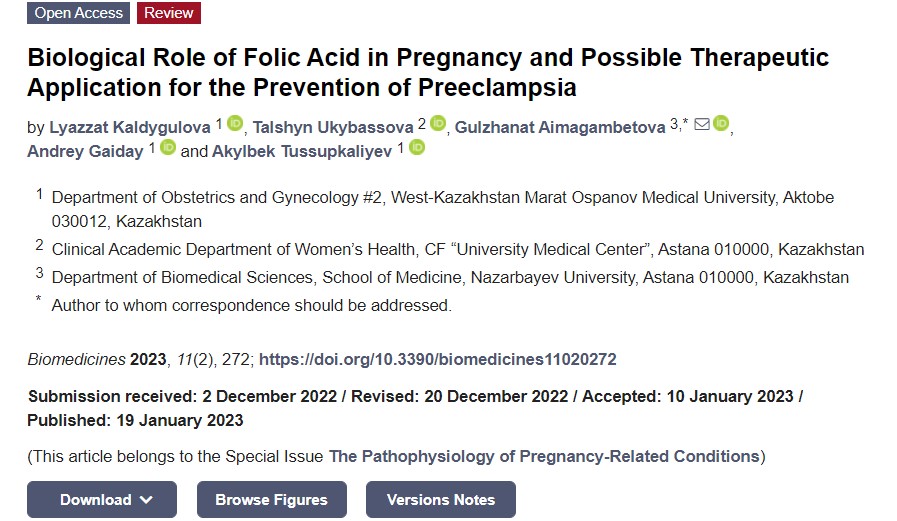 [1] Калдыгулова Л, Укыбасова Т, Аймагамбетова. Г и др. Биологическая роль фолиевой кислоты при беременности и возможные терапевтические возможности Применение для профилактики преэклампсии. Биомедицина, 2023, 11(2): 272.https://doi.org/10.3390/biomedicines11020272