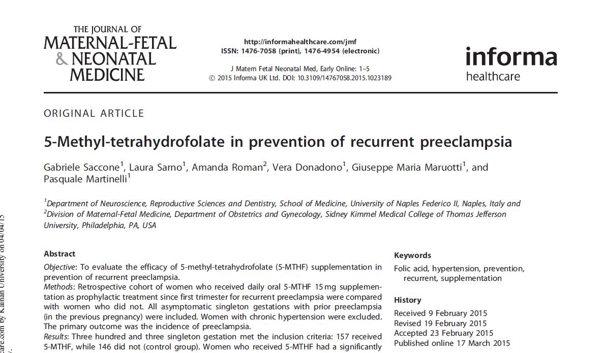 Итальянец 2015 года. ретроспективное когортное исследование (n = 303 женщины с предшествующей преэклампсией) показало, что Прием 15 мг 5-МТГФ ежедневно, начиная с первого триместра, снижал общее количество рецидивов. преэклампсия от 39,7 % до 21,7 % (ОШ 0,57, 95 % ДИ 0,25–0,69), тяжелая преэклампсия от 8,9 % до 3,2 % (ОШ 0,44, 95 % ДИ 0,12–0,97) и раннее начало преэклампсия от 7,5 % до 1,9 % (ОШ 0,34, 95 % ДИ 0,07–0,87) [2].