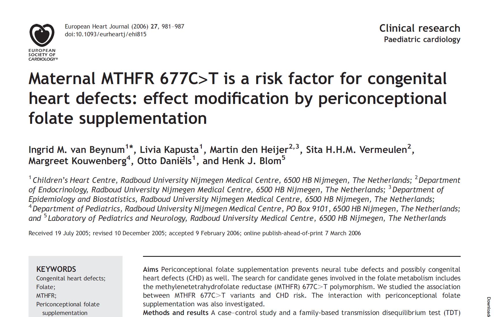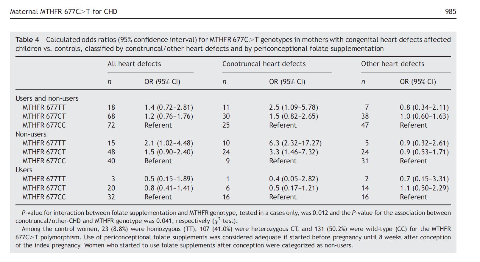 Среди 165 семей с врожденными сердечно-сосудистые заболевания (ИБС) и 220 контрольных семей, матери-носители MTHFR 677 Генотип CT или TT и НЕ принимали добавки фолиевой кислоты в период беременности. гораздо более вероятно иметь ребенка с пороками сердца проводящего типа (ОШ 3,3 и 6.3 соответственно).