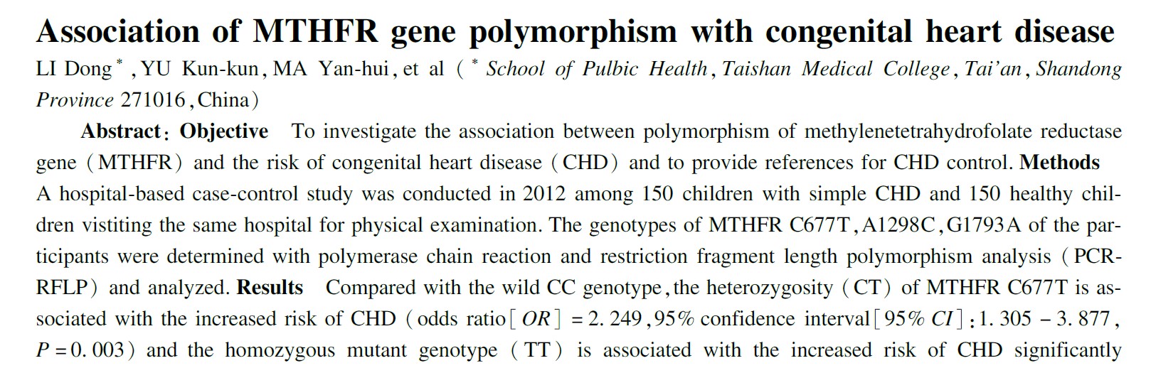 Исследование детской больницы Цилу в Шаньдуне Университет показал, что аллель T MTHFR C677T увеличивает вероятность ИБС в 1,8 раза; Генотипы TT и CT повышают риск в 3,1 и 2,2 раза.