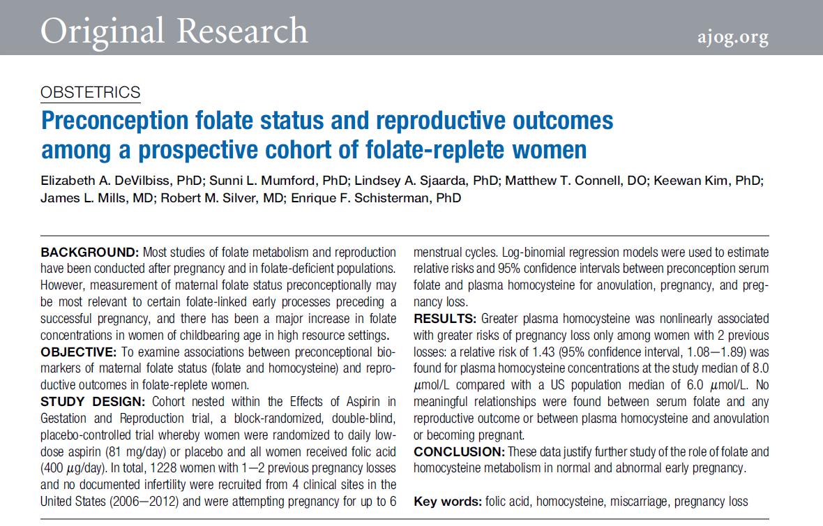 Исследователи проспективно наблюдали за 1228 женщинами с одним или несколькими заболеваниями в анамнезе. с двумя предыдущими выкидышами, которые постоянно принимали 400 мкг фолиевой кислоты кислоты ежедневно. Результаты показали: