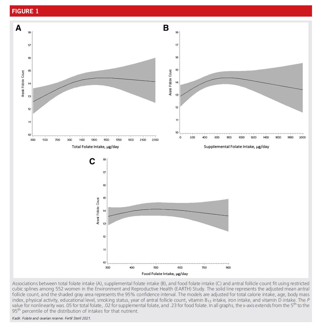 Данные показали, что положительная корреляция между общее потребление фолиевой кислоты и AFC достигают плато примерно через1200 микрограмм в день. Максимальная польза от приема фолиевой кислоты из добавок (фолиевая кислота, синтетическая фолиевой кислоты) происходит примерно800 микрограмм в день. По сравнению с женщинами с ежедневным прием 400 мкг фолиевой кислоты, те, кто потребляет 800 мкг в день ожидается увеличение примерно на1,5 фолликула.