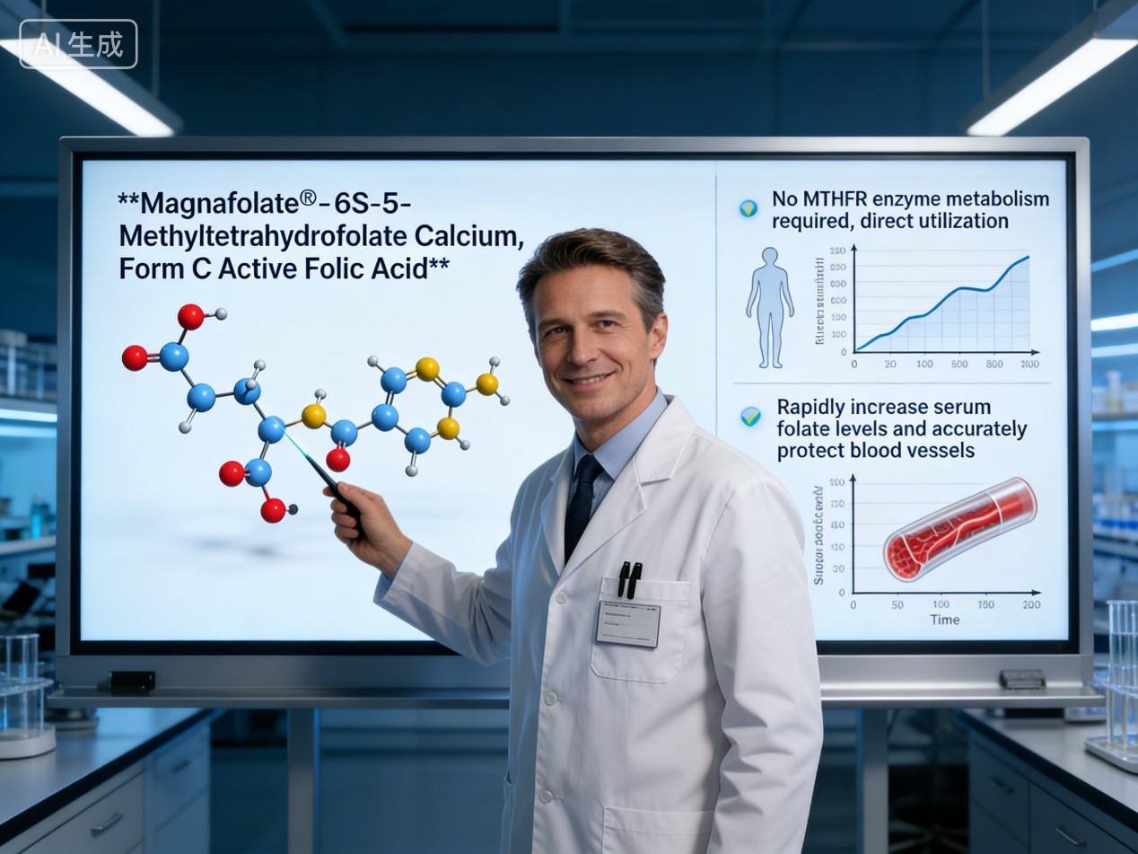 Магнафолат®, а 6S-5-метилтетрагидрофолат кальция (кристаллический активный фолат) соответствует этому основная клиническая потребность. Будучи по своей природе активным фолатом, он требует нет фермента MTHFR обмен веществ и поступает в организм готовым к немедленному использованию, быстро присоединиться к пути развала HCY, чтобы прояснить это“тихий абразивный”сосудов. Он быстро повышает уровень фолата в сыворотке крови. уровнях, обеспечивая своевременную и целенаправленную защиту сосудов, идеально подходящую для постменопаузальные ферментативные изменения, тем самым устраняя“дополнять, но не усваивать”проблема.